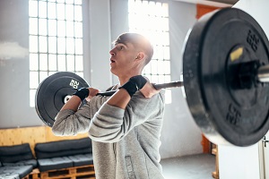 다리 간격 어깨너비로 보다 넓게 벌리고, 발끝 방향은 45도 각도로 회전시키고 서서 두 손으로 덤벨 또는 케틀벨을 양손으로 잡고 겨드랑이 쪽에 힘을 주고 턱 아래 위치시킵니다.
